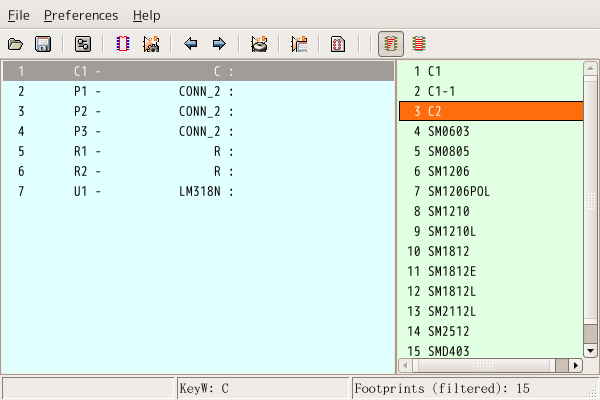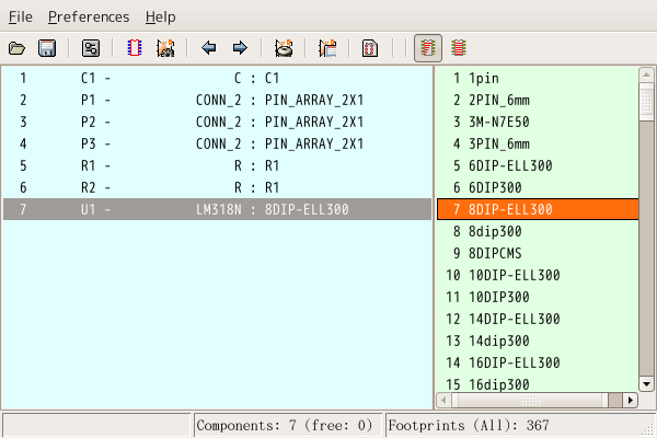 CVpcbは部品にランドパターン(フットプリント)を割り当てる作業をする。 一般的なフットプリントは揃っているので、新しいフットプリントを必要とすることは少ないかも。 この辺はEagleより便利かもしれない。