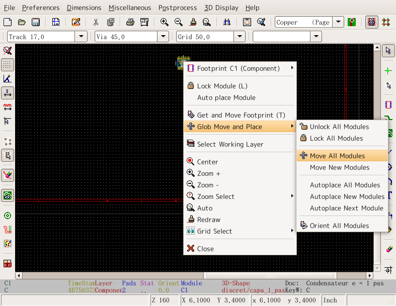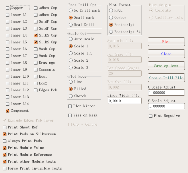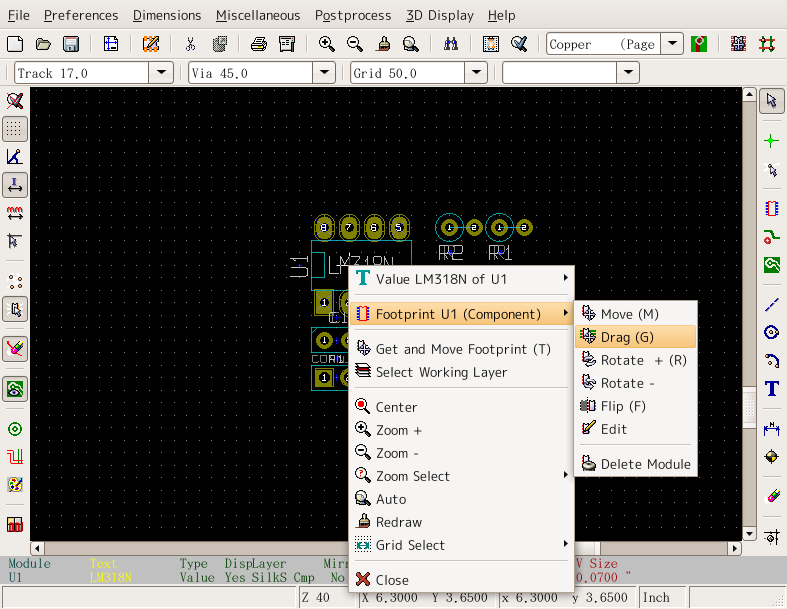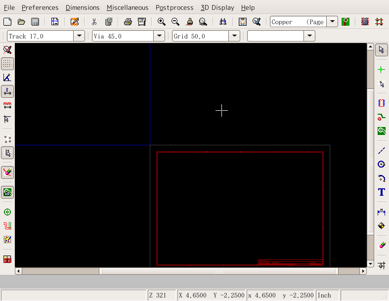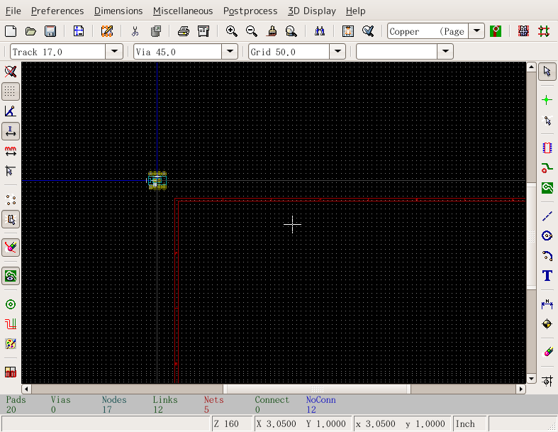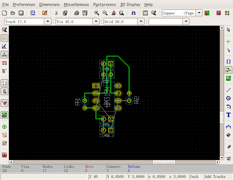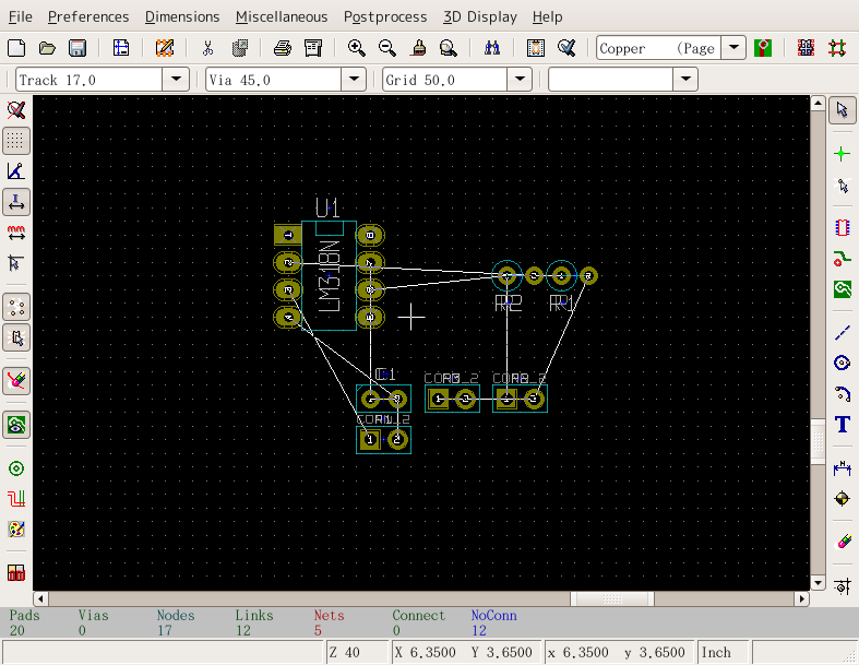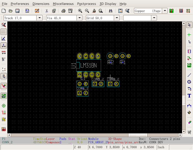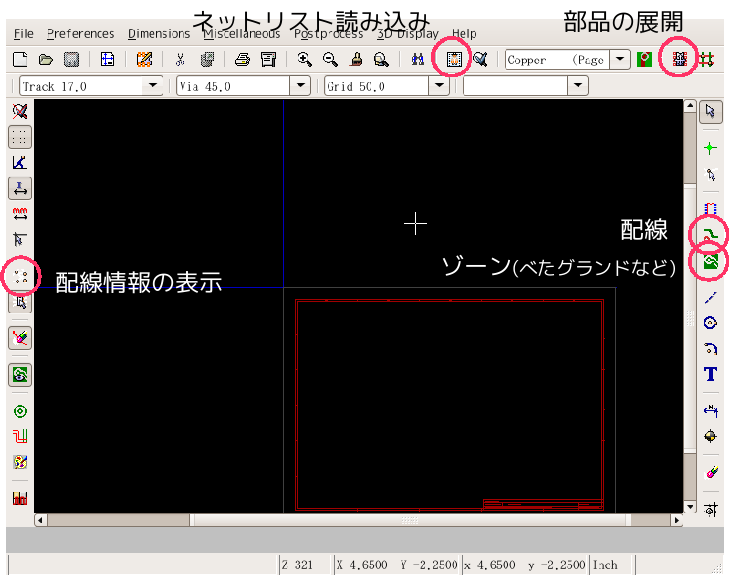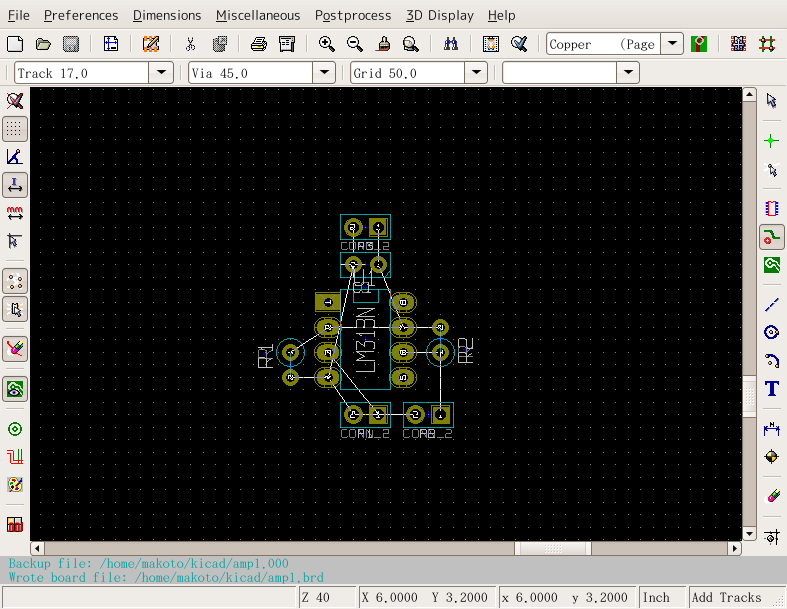 KiCADの古いバージョンで説明しているので最新バージョンとは多少違います 立ち上げKiCADのメインウィンドウかEESchemaから立ち上げられる。 立ち上げた状態 まずCVpcbで作ったネットリストを読み込む。EESchemaの方で訂正した場合はネットリストを作成後、それを読み込む。「Read」というボタンをクリック ネットリスト読み込むと左上に部品が読み込まれる。やりにくいので四角で選択して適当な位置に持ってくる。 全ての部品が重なっているので、「Mode Module」というボタンをクリックしてから部品を右クリックするとサブメニューが表示される。「Move All Modules」というの選択すると 全ての部品が展開される。 EESchemaと同様に部品を右クリックしサブメニューから操作を選んで配置していく。 ドラッグやムーブだと配線用の線が表示されるが、配線表示ボタンをクリックしておくと常に表示されるようになる。 大体配置がすんだら配線をしていく 配線していく。部品の位置や方向を直しながら配線していく。 配線が終わったら次はプロット 「File」→「Plot」と選ぶ。「Print」は画質が悪いので使わない。 プリント基板業者に出したり、プリント基板加工機を使うときはガーバーフォーマットでプロットし、感光基板などを使うときはポストスクリプトでプロットする。 広告 |