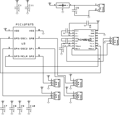 12F629や12F675でシリアル通信12F629や12F675のようにシリアル通信の機能「USART」が無い場合は自力でタイミングなどを設定する必要がある。 RS232Cの場合、ただ通信するだけなら送信、受信の2本線があれば良く、GNDと合わせても3本線で通信ができるので簡単。 必要な部品コンデンサや抵抗以外には