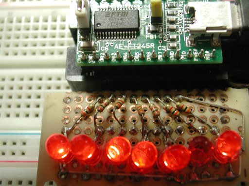 接続してみる。つないだ後、 # dmesg を実行すると usb 7-3.1: new full speed USB device using ehci_hcd and address 5 usb 7-3.1: configuration #1 chosen from 1 choice ftdi_sio 7-3.1:1.0: FTDI USB Serial Device converter detected drivers/usb/serial/ftdi_sio.c: Detected FT232BM usb 7-3.1: FTDI USB Serial Device converter now attached to ttyUSB0 ftdi_sio ttyUSB0: FTDI USB Serial Device converter now disconnected from ttyUSB0ftdi_sio 7-3.1:1.0: device disconnected usb 7-3: reset high speed USB device using ehci_hcd and address 3 usb 7-3.1: new full speed USB device using ehci_hcd and address 6 usb 7-3.1: configuration #1 chosen from 1 choice ftdi_sio 7-3.1:1.0: FTDI USB Serial Device converter detected drivers/usb/serial/ftdi_sio.c: Detected FT232BM usb 7-3.1: FTDI USB Serial Device converter now attached to ttyUSB0 と表示される。これはシリアル変換部分なので表示はFT232系と同じ。 # lsusb では Bus 007 Device 013: ID 0403:6001 Future Technology Devices International, Ltd FT232 USB-Serial (UART) IC という表示だった。 ftdi_sioというシリアル変換用のモジュールが動いているとエラーになるみたいだが、僕が使っている分にはこのモジュールが動いていても問題なさそうだった。 # lsmod で動いているモジュールを表示して、ftdi_sioがあるようなら rmmod ftdi_sio とやって止める。 プログラム作成両方のライブラリともサンプルプログラム(C言語で記述されている)が添付されているので、それをコンパイルして使ってみる。 コンパイルは、公式版の場合はサンプルプログラムのMakefileを見ればいい。 LEDを光らせてみるそれぞれのbitで直接LEDを駆動できるので、1kΩぐらいの抵抗を介して、LEDを接続するとLEDをON-OFFできる。 広告 |
