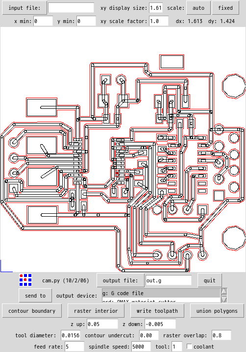 「contour boundary」をしたところ。この図だと線の間が狭いところはちゃんと切れていない。こう言う場合は切削ドリス径をより細いものにする必要がある。