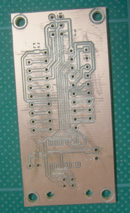 下の写真はパターンをVカッターで加工して、穴と外形は0.8mmのエンドミルを使った。